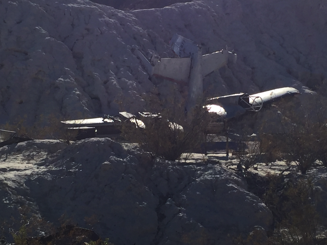 A crashed plane in El Dorado Canyon amongst all the old cars.