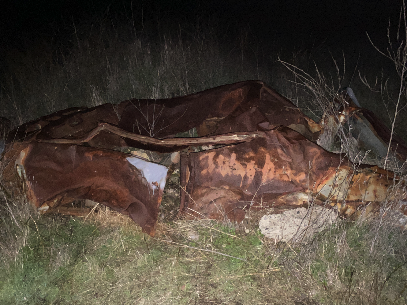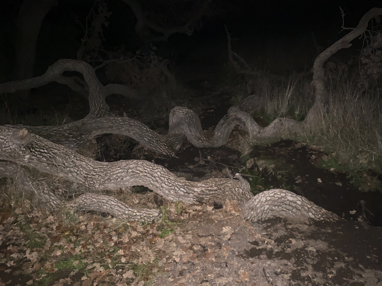 in the dark past a fallen tree (that looked like a sea monster) to a very old adandoned car.